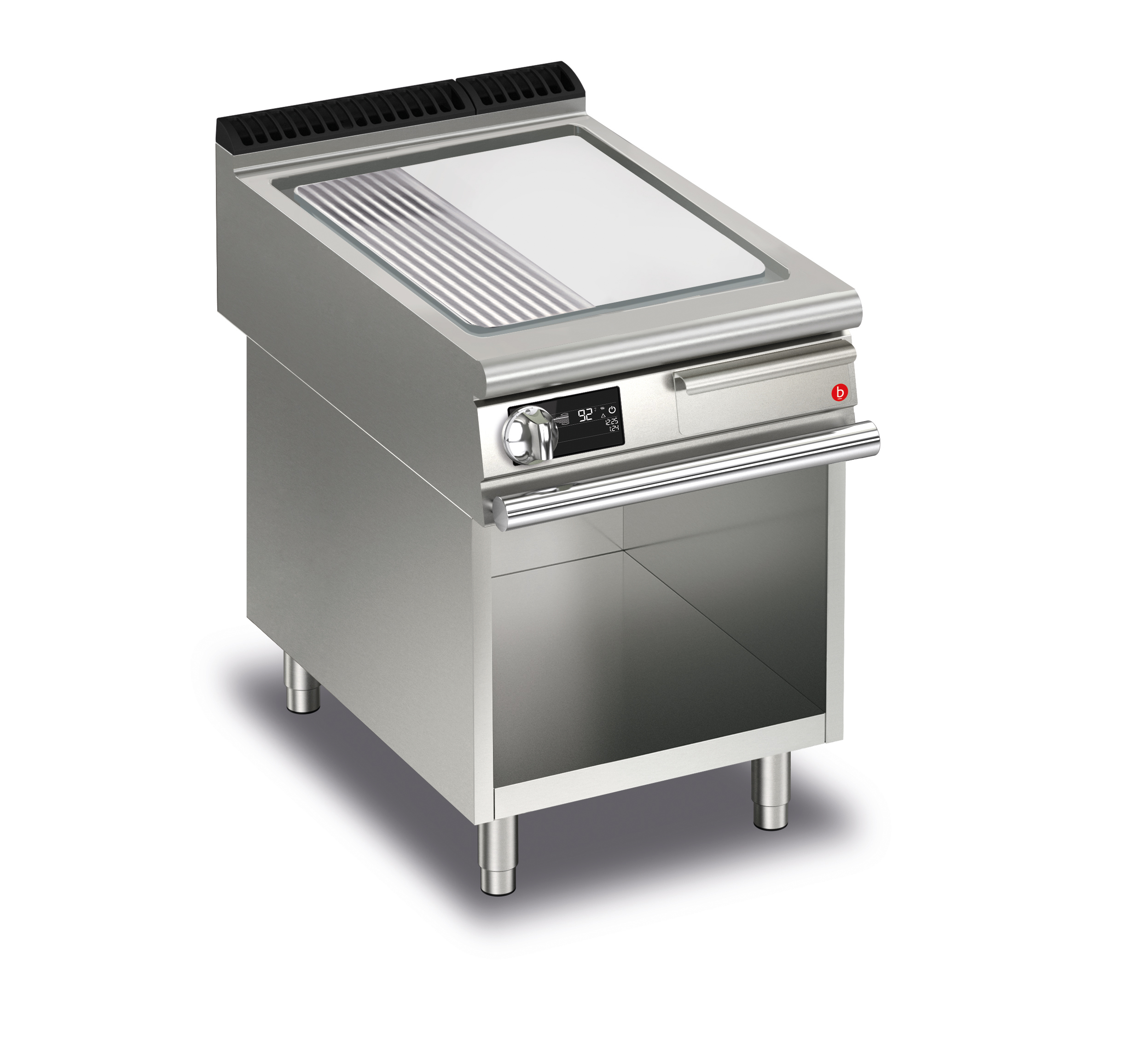 Elektrisk stekhäll BARON QT90SFTV/E823-T4W med slät & 1/3 räfflat stekplatta i AISI430 stål, på öppet stativ, 800x900mm, 15kW, Touchscreen