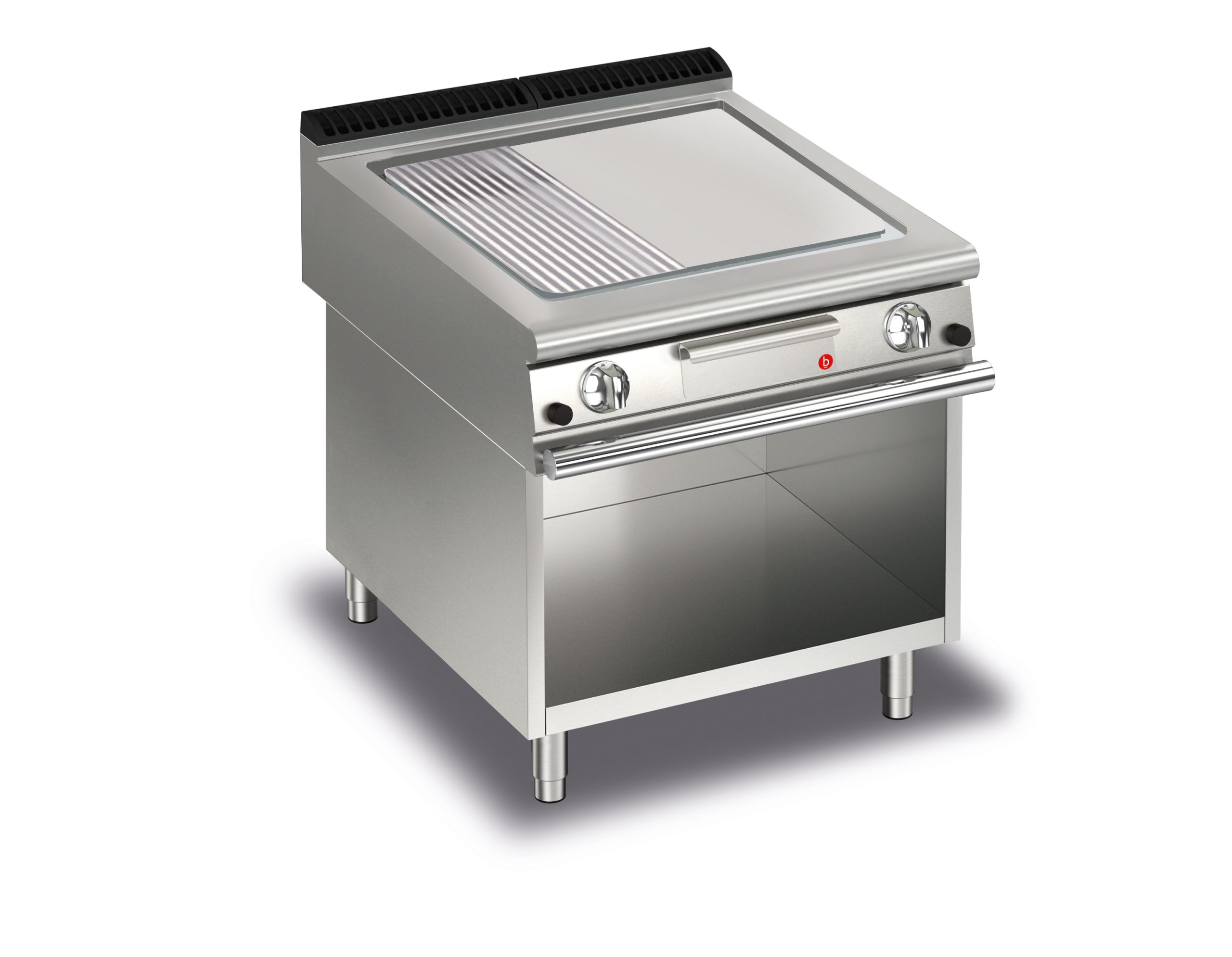 Gas stekhäll BARON Q70SFTTV/G823 med slät & 1/3 räfflad stekplatta i AISI430, på öppet stativ, 800x700mm, 12kW