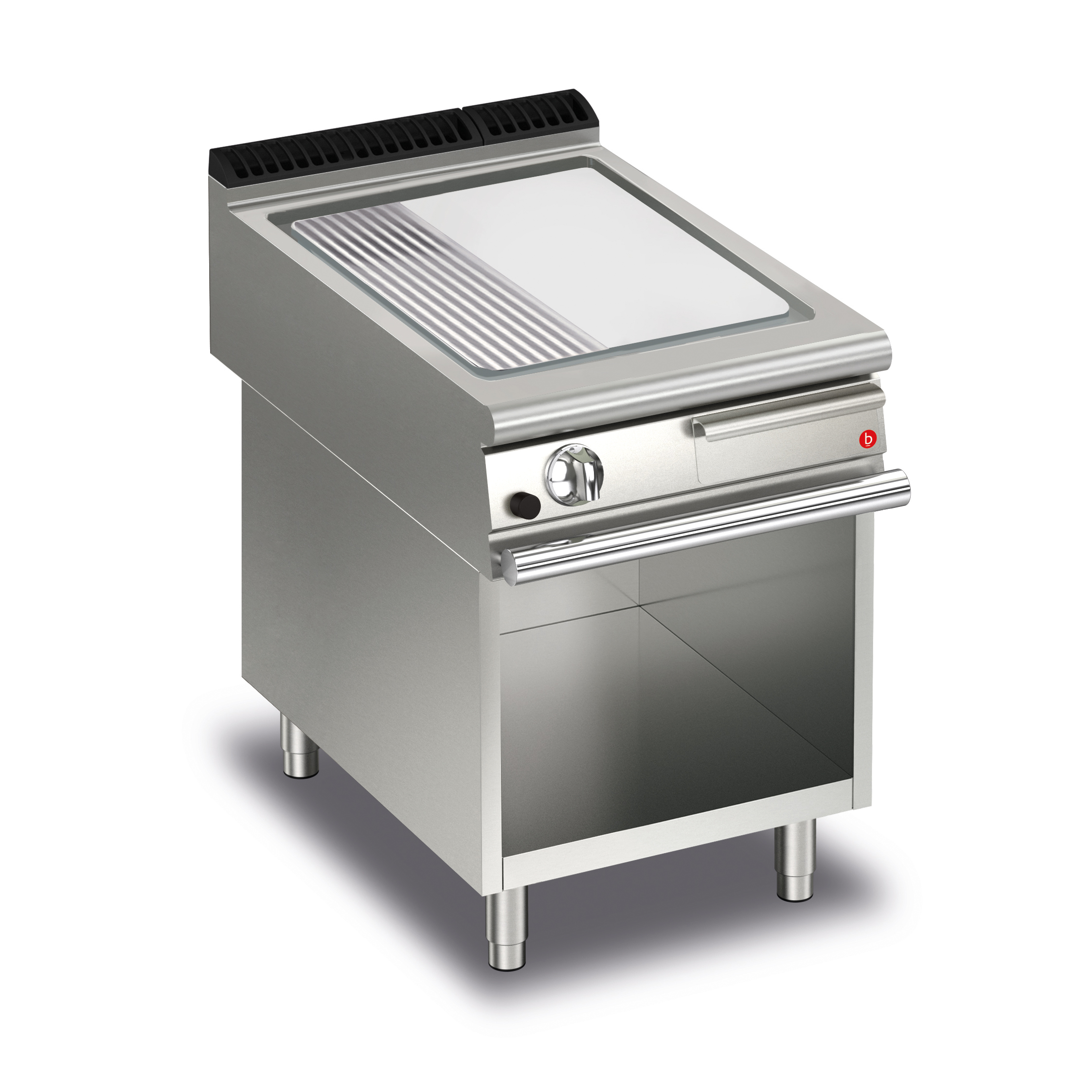 Gas stekhäll BARON Q90SFTTV/G625 med slät & 1/3 räfflad kromat stekplatta, på öppet stativ, 600x900mm, 14kW