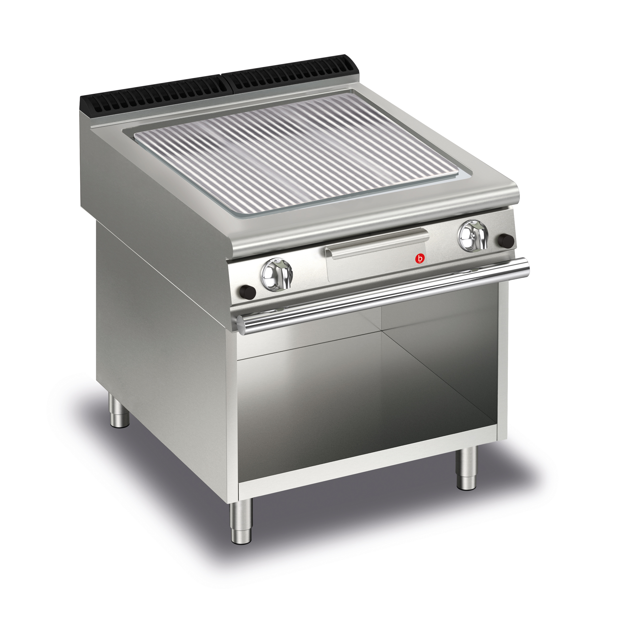 Gas stekhäll BARON Q90SFTTV/G813 med räfflad stekplatta, i AISI430 stål, på öppet stativ, 800x900mm, 14kW