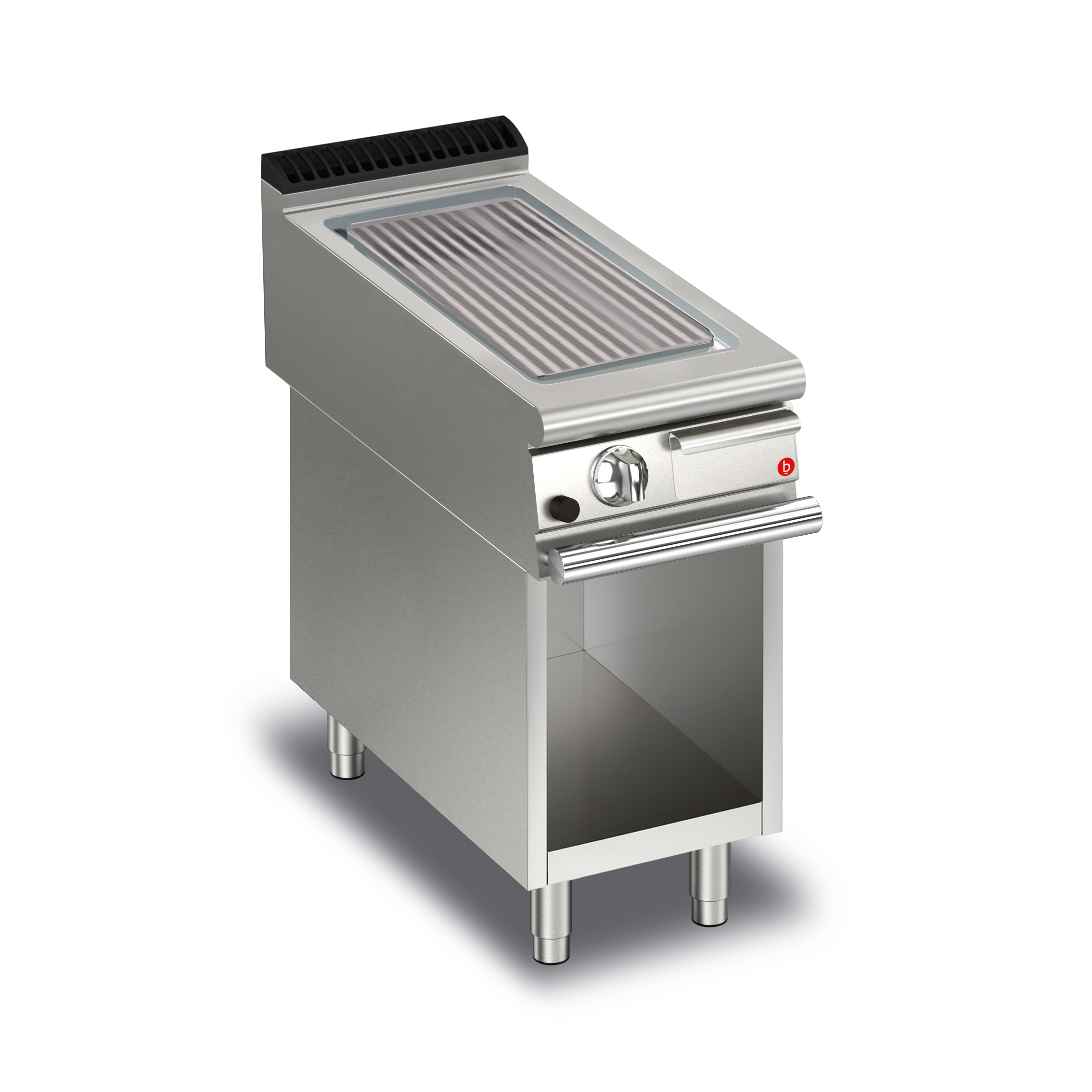Gas stekhäll BARON Q90SFTV/G413 med räfflad stekplatta, i AISI430 stål, på öppet stativ, 400x900mm, 7kW