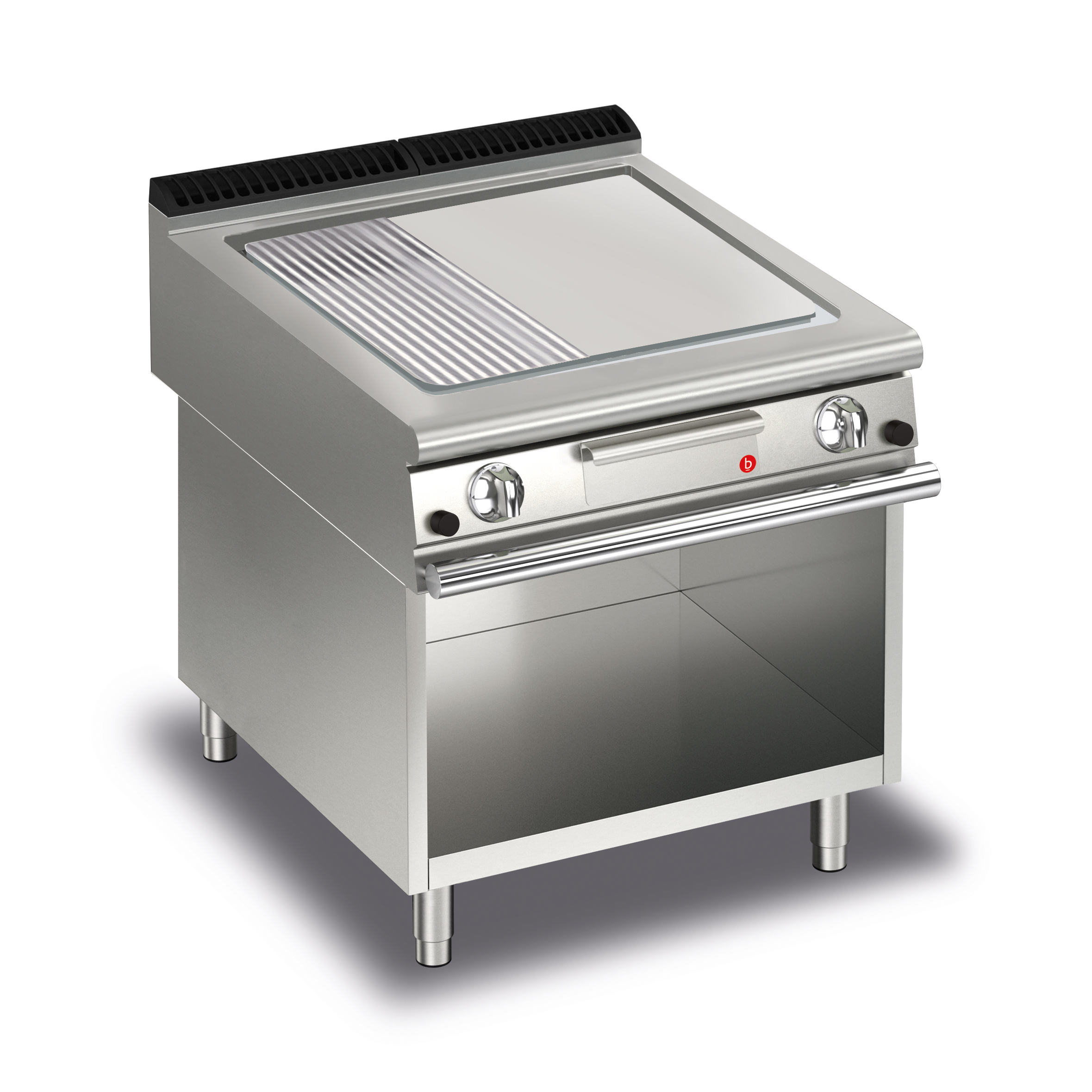 Gas stekhäll BARON Q90SFTV/G823 med slät & 1/3 räfflad stekplatta, i AISI430 stål, på öppet stativ, 800x900mm, 14kW